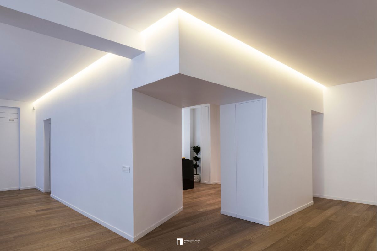 Armadi filomuro 1 anta angolo 45°, con tipo di chiusura premi-apri (nessuna maniglia) e dipinto come la parete per il massimo effetto a scomparsa.