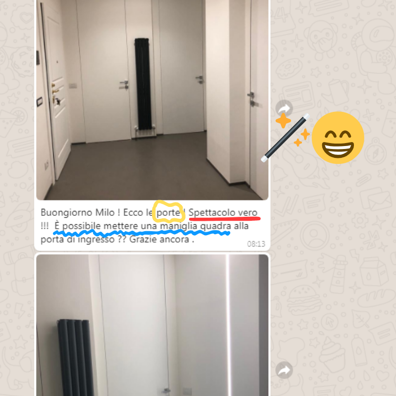 Per questo lavoro sono stati realizzati più prodotti: 1 Armadio filomuro ad 1 anta con senso di apertura verso sinistra e con tipo di chiusura pomello a incasso estraibile argento satinato; 1 sportello filomuro ad anta singola con senso di apertura verso sinistra e con tipo di chiusura pomello a incasso estraibile argento satinato per chiudere un vano tecnico; 2 porte battenti filomuro con apertura sinistra a spingere e con maniglia a incavo. Tutte le ante sono finite con carta da parati nello stile giungla tropicale.