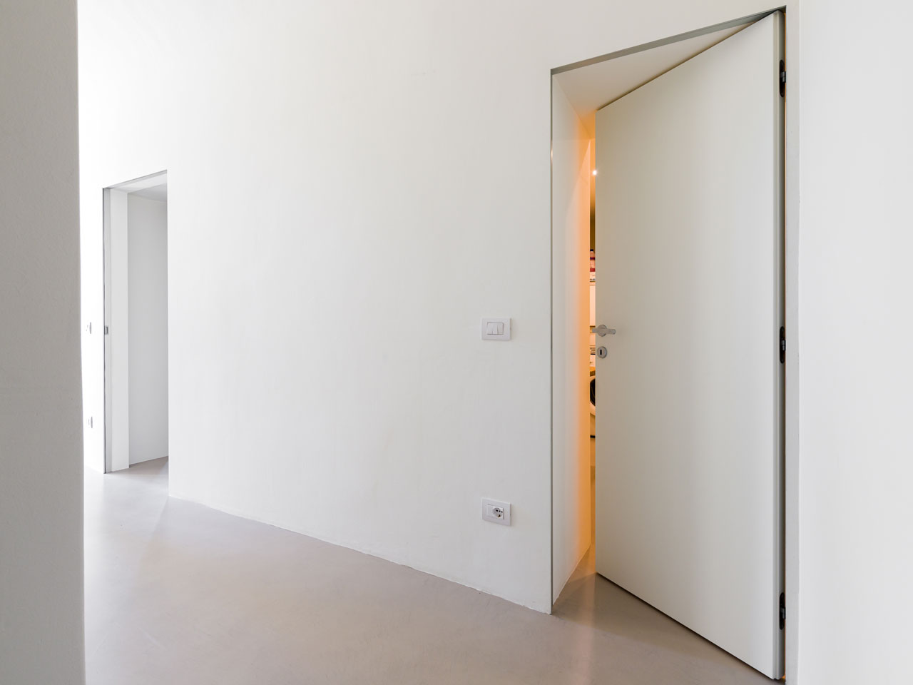 In questo ambiente possiamo trovare due tipologie di Porte battenti filomuro 260H: una porta battente filomuro 260H con sistema di chiusura con la maniglia A SCOMPARSA RETTANGOLARE con il nottolino privacy solo dal lato interno a cura del cliente e una porta battente filomuro 2 ante 260H con sistema di chiusura con la maniglia A SCOMPARSA RETTANGOLARE. Le ante sono dipinte come la parete per il massimo effetto a scomparsa.