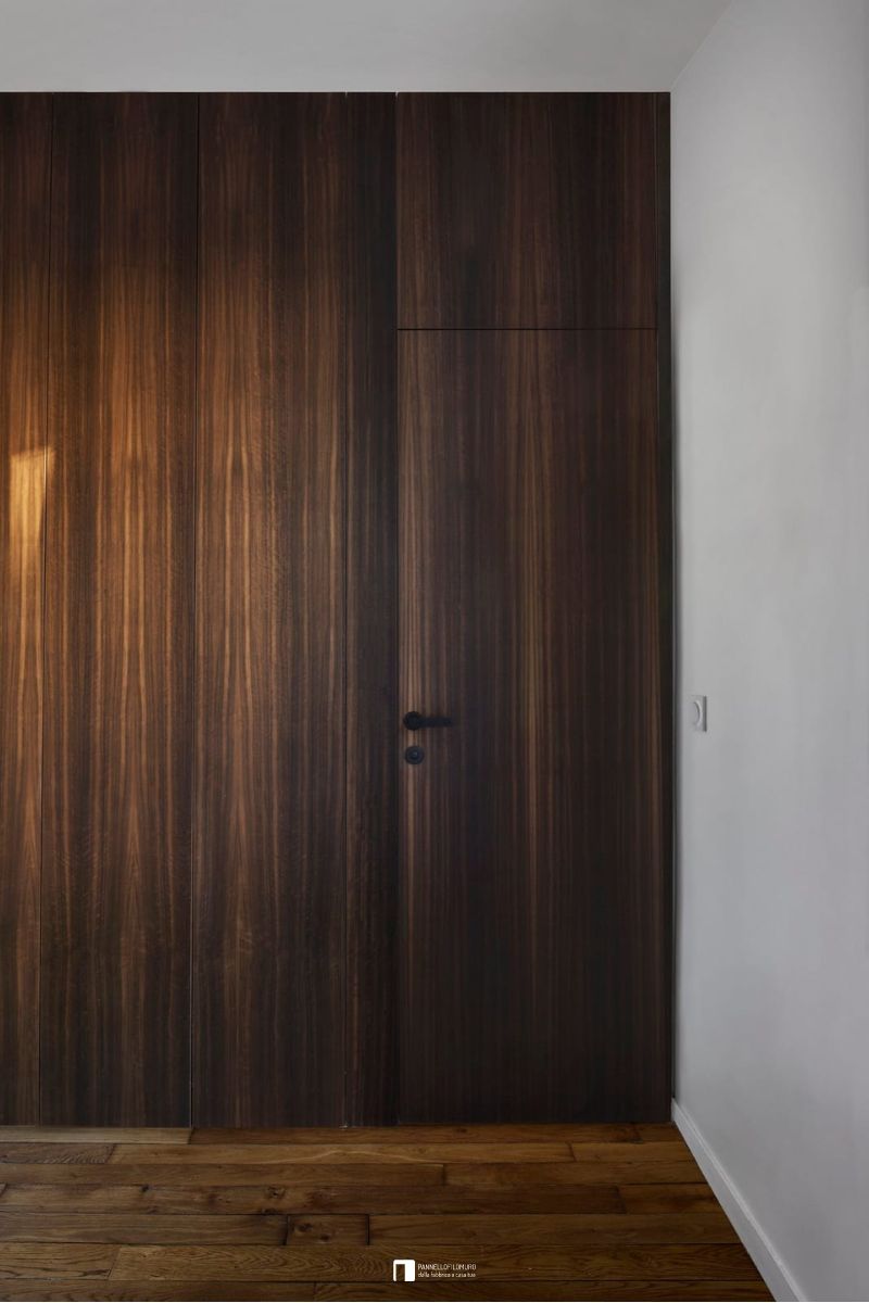 Porta battente filomuro con maniglia a cura del cliente e in finitura essenza di legno come la parete adiacente
