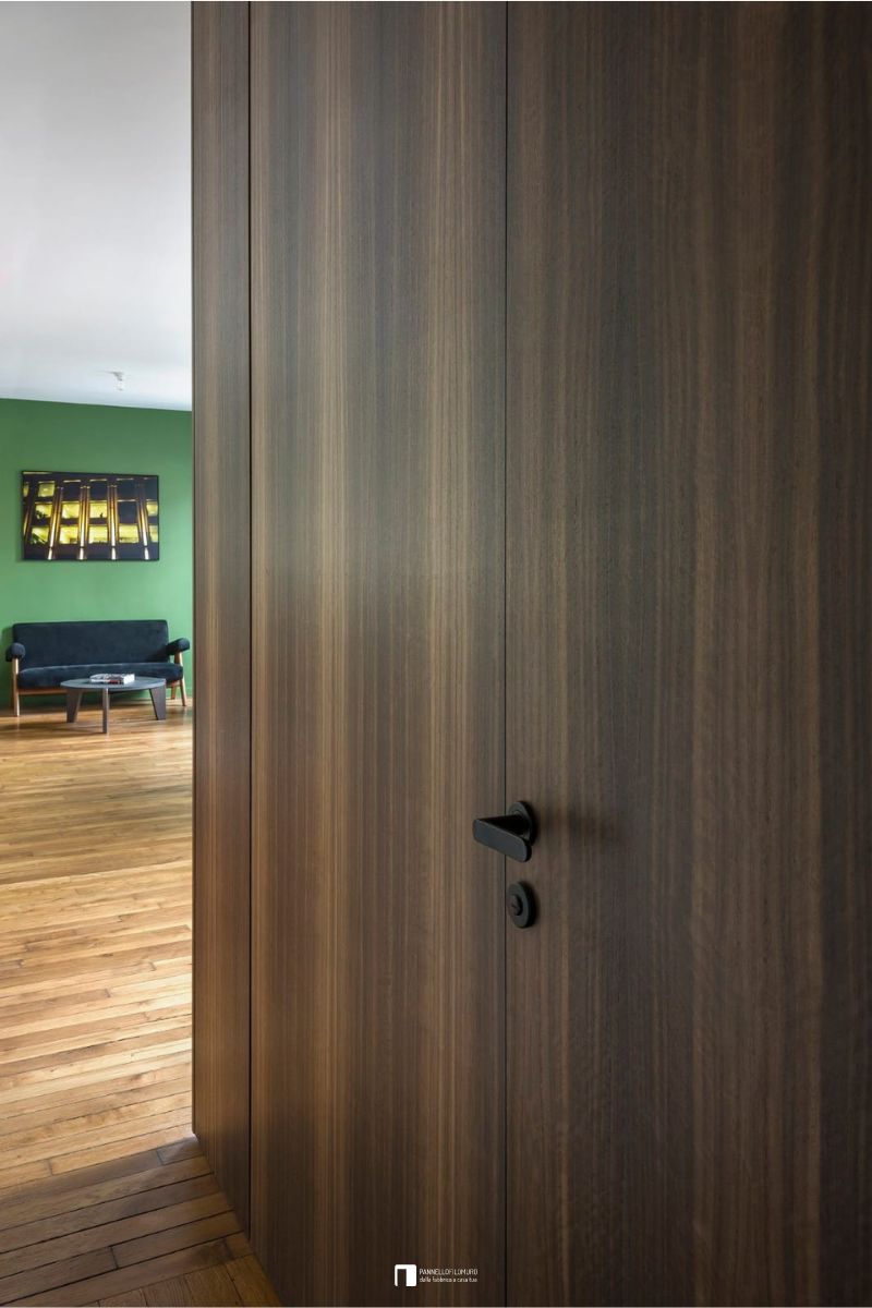 Porte battenti filomuro 270H con sistema di chiusura con la maniglia Sirio, dalla forma sinuosa. Le ante sono dipinte come la parete per il massimo effetto a scomparsa.