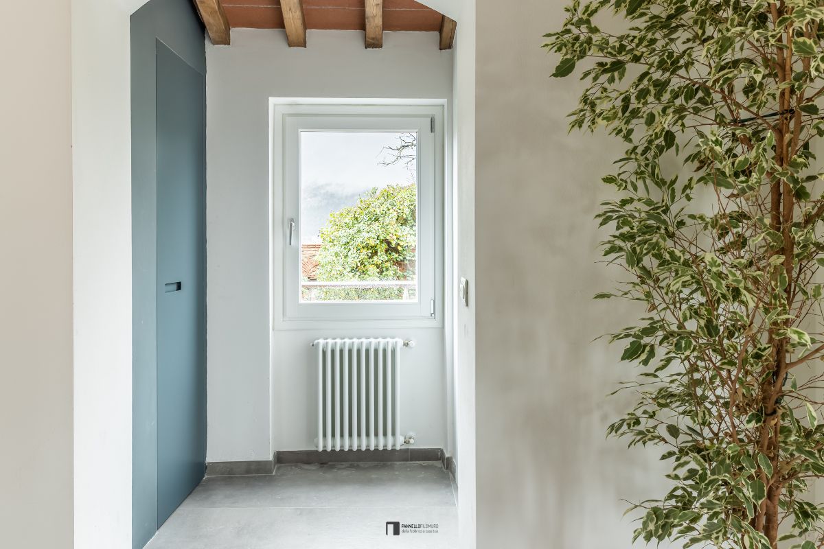 In questo locale sono state utilizzate due porte battenti: una porta battente filomuro standard (a destra) e una porta battente filomuro speciale (a sinistra) entrambe con sistema di chiusura con la maniglia A INCAVO.