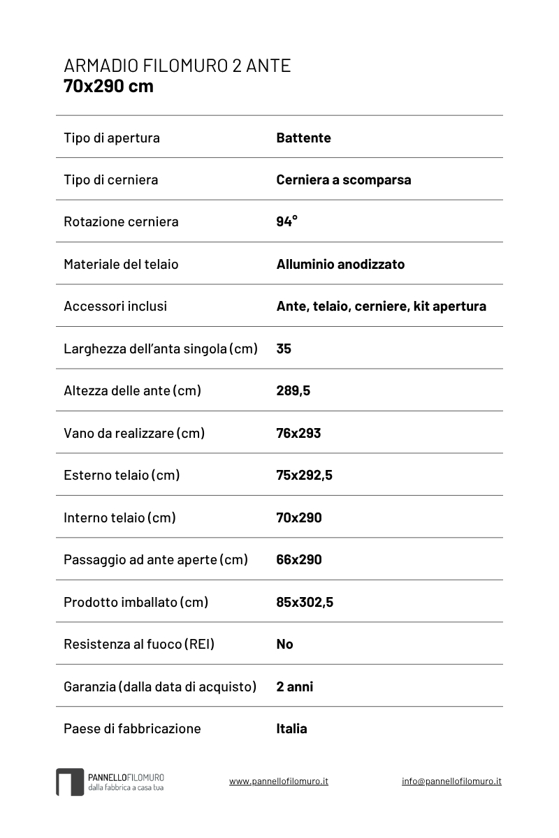 Armadio filomuro a 2 ante simmetriche cm 70×290