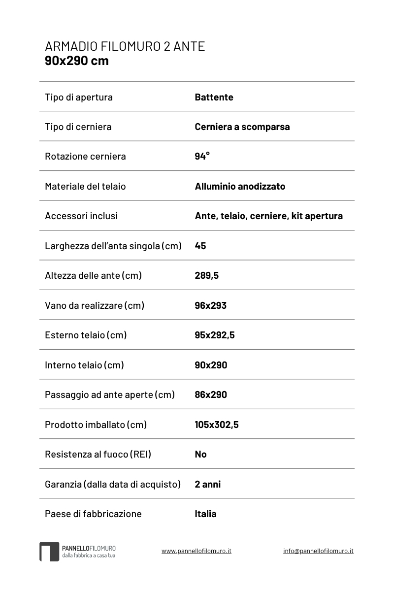 Armadio filomuro a 2 ante simmetriche cm 90×290