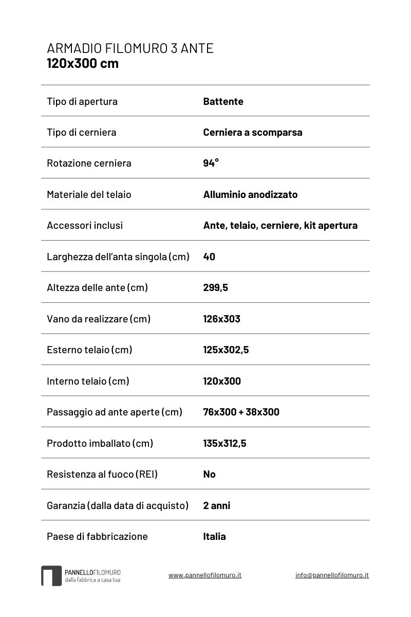 Armadio filomuro a 3 ante simmetriche cm 120×300